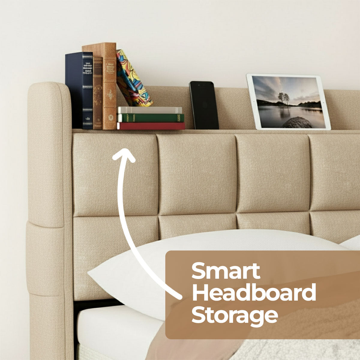 Smart headboard storage: Two built-in pockets keep devices, books, and essentials within easy reach.