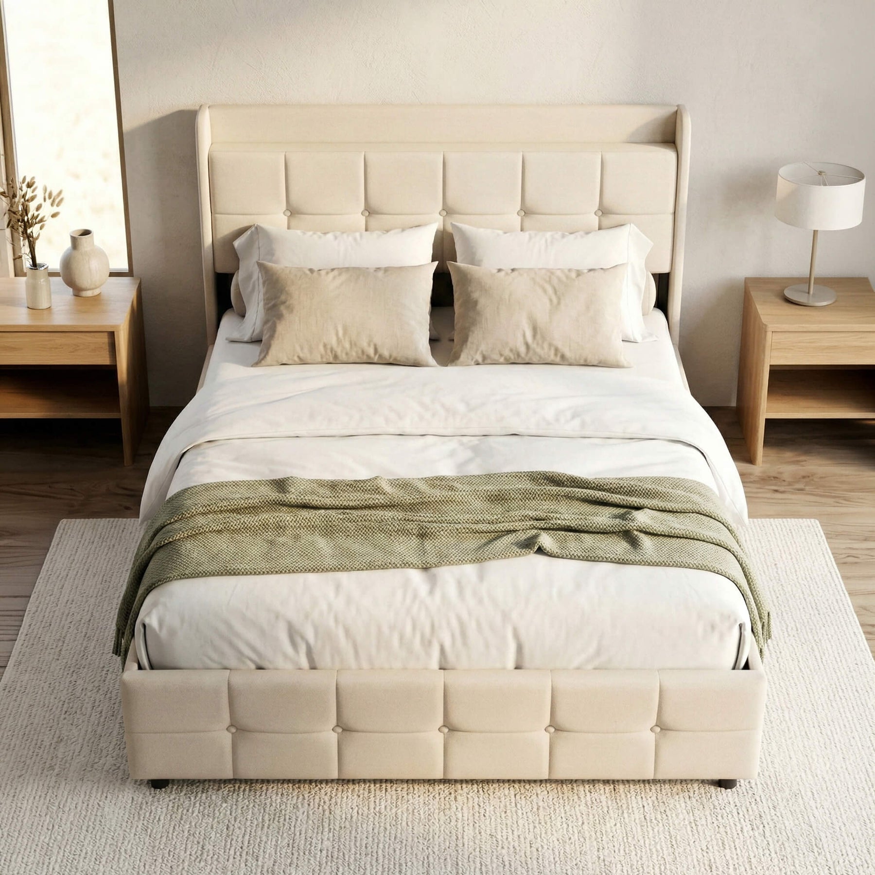 Enjoy the perfect balance of modern comfort and smart storage with the Phoenix Upholstered Fabric Bed – Beige. With a padded headboard, built-in storage pockets, and four spacious drawers, this bed is designed to maximise functionality without sacrificing style. The soft quilted upholstery adds a touch of elegance while blending seamlessly with modern interiors, making it both a practical and stylish choice for any bedroom.