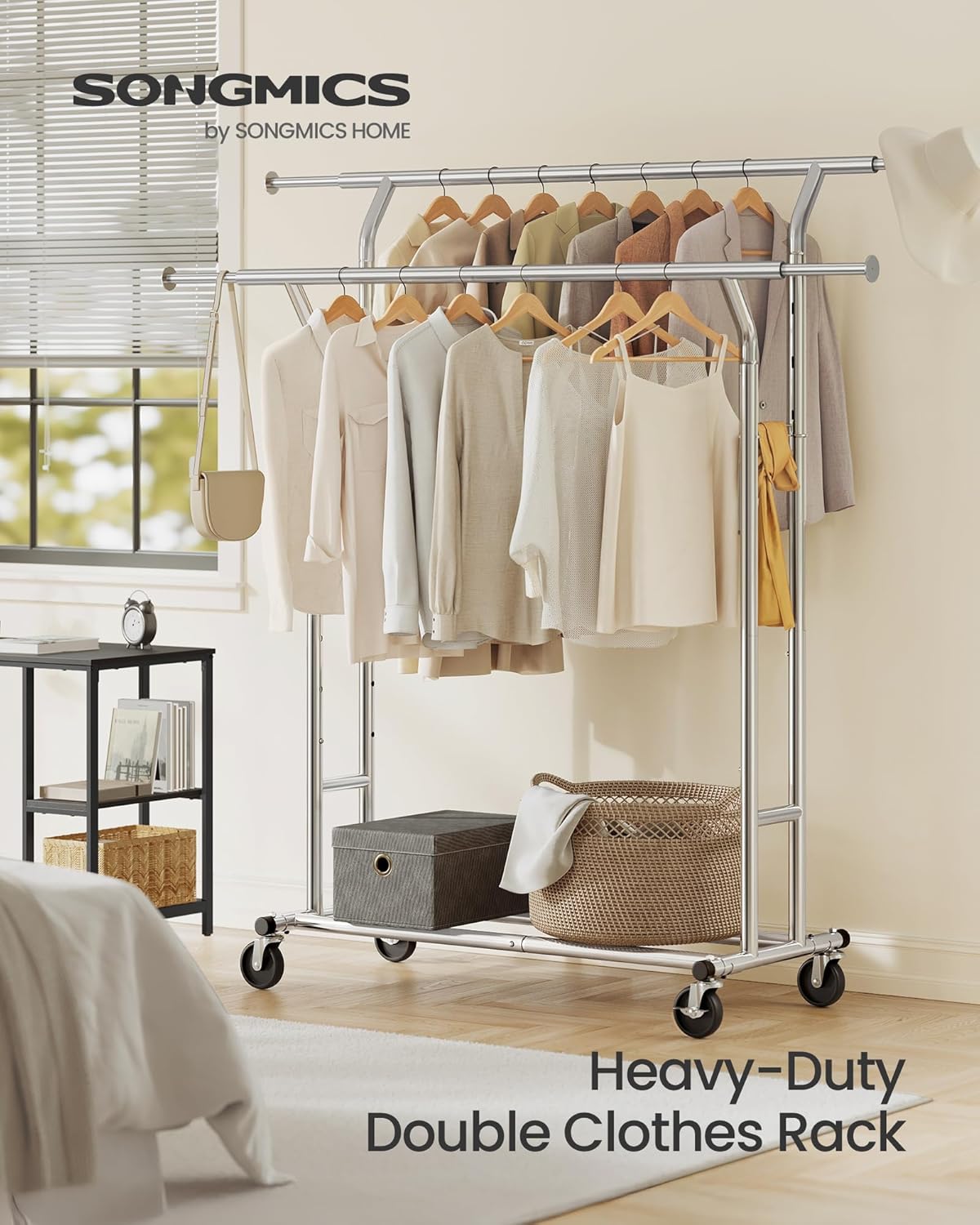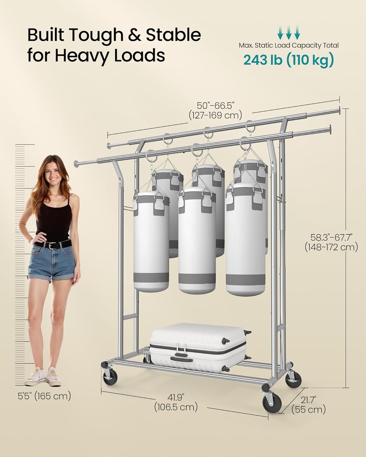 Adjustable Height: The height of this clothes rack also can be adjusted (148-172 cm) to hang clothes of different sizes. 3 different height configurations of the lateral bracing to meet any requirement.