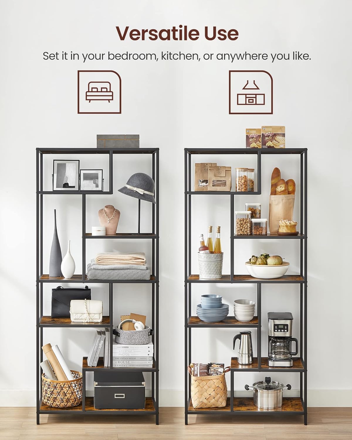 • Tiered shelving design: Six open shelves in varying heights (from 26.4 cm to 57.5 cm) accommodate everything from tall vases to small ornaments with ease.