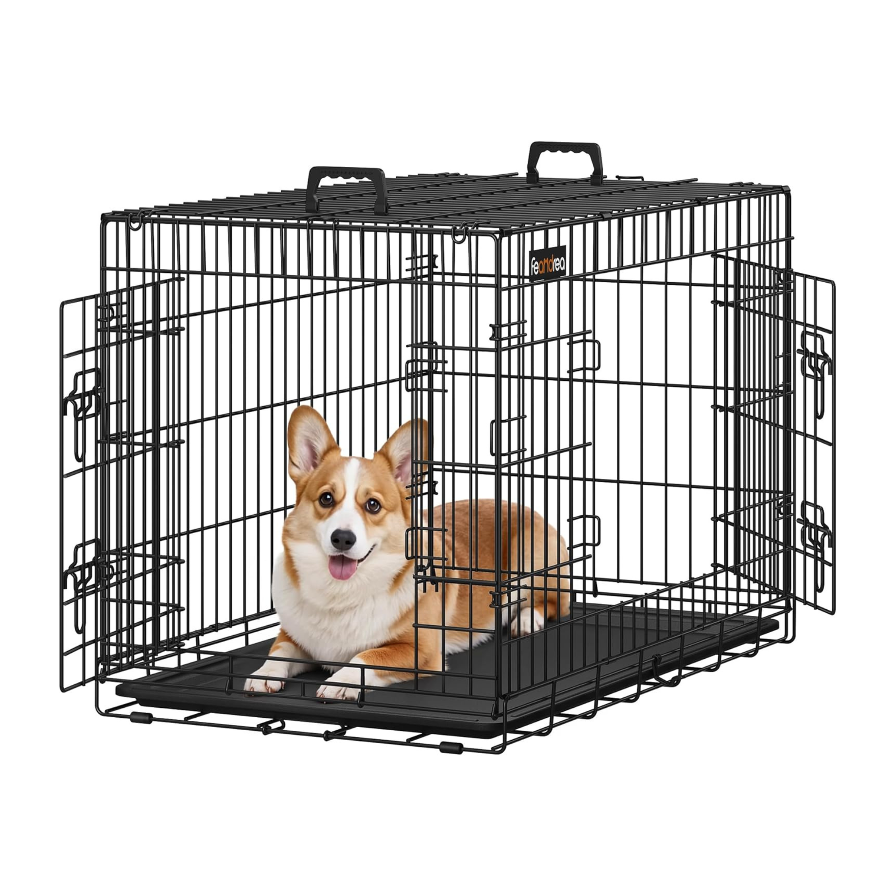 The two doors and removable tray make cleaning effortless, while L-shaped bolts ensure your pet's safety. Our scientifically designed crate is also incredibly easy to assemble and disassemble, without the need for any tools. With its rounded edges and corners, this crate can effortlessly blend in with your home decor. Upgrade to our dog crate today, providing your beloved pet with a comfortable and happy home away from home.