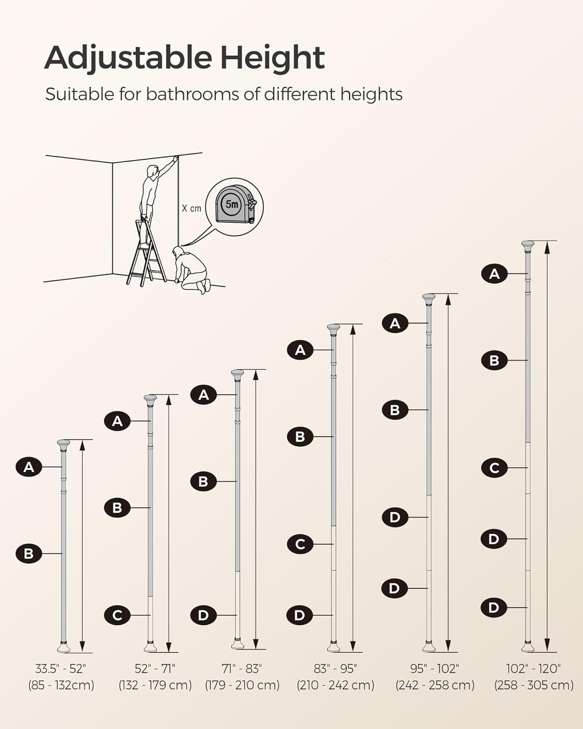 It is easy to assemble and no drilling and tools are required. The height is also adjustable. The max. height of this shelf is 305cm. Adopting the advanced coating process, the tube is rust-resistant. A great holder for your bathroom essentials with 4 large trays and 1 towel rail.