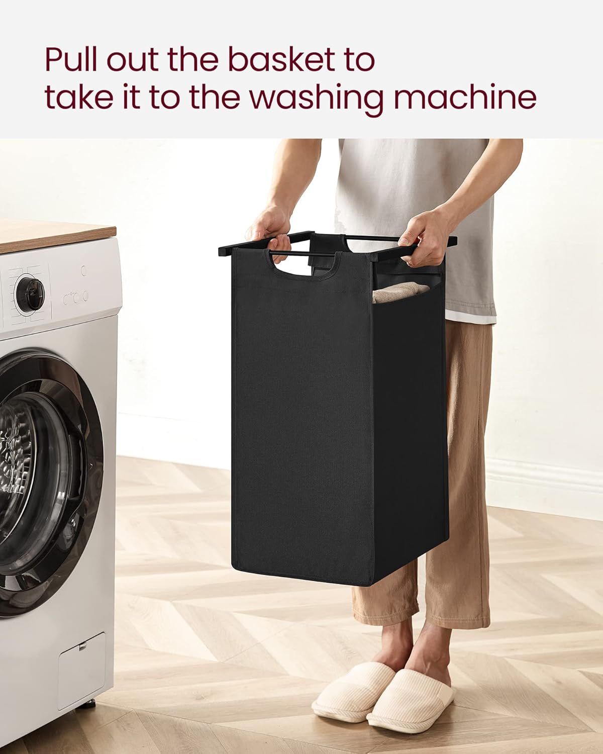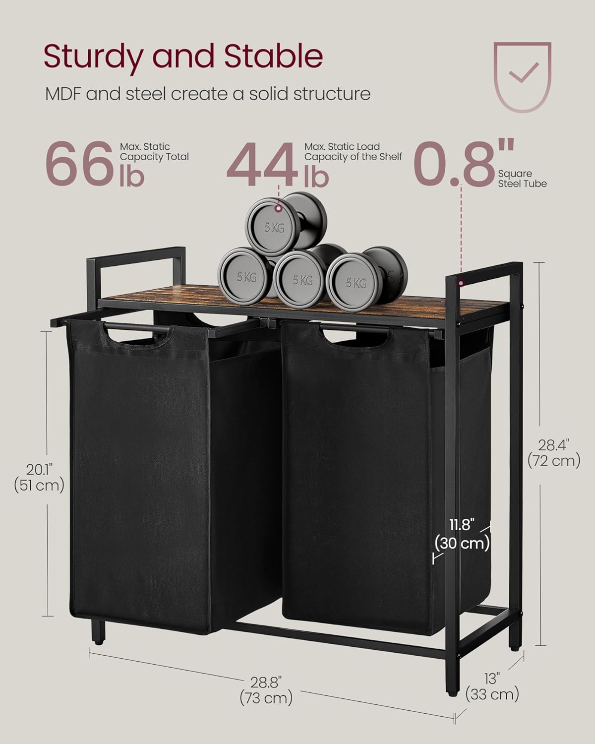 EASY TO EXTEND AND REMOVE LAUNDRY BAGS: The two compartments of this laundry basket are supported at the bottom with a plastic plate to prevent sagging. The Velcro fasteners make it easy to pull out and remove the laundry bags, allowing you to transport them effortlessly to the washing machine.