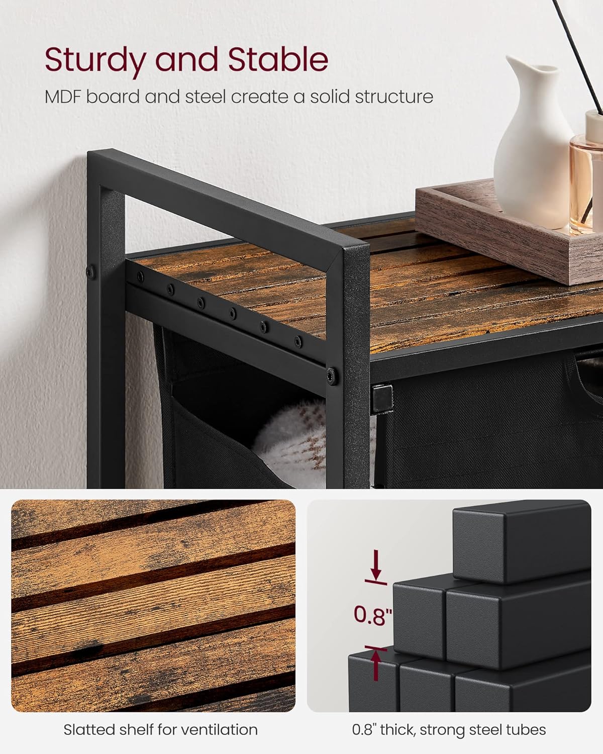 ADDITIONAL STORAGE SHELF: With the inclusion of a shelf, this laundry hamper provides extra storage space, allowing you to conveniently keep bathroom essentials, detergent, and fabric softener within easy reach. Strong and durable: The laundry sorter is built with a sturdy steel frame and high-quality MDF, ensuring a high level of stability. Adjustable feet and tilt protection parts further enhance its stability.