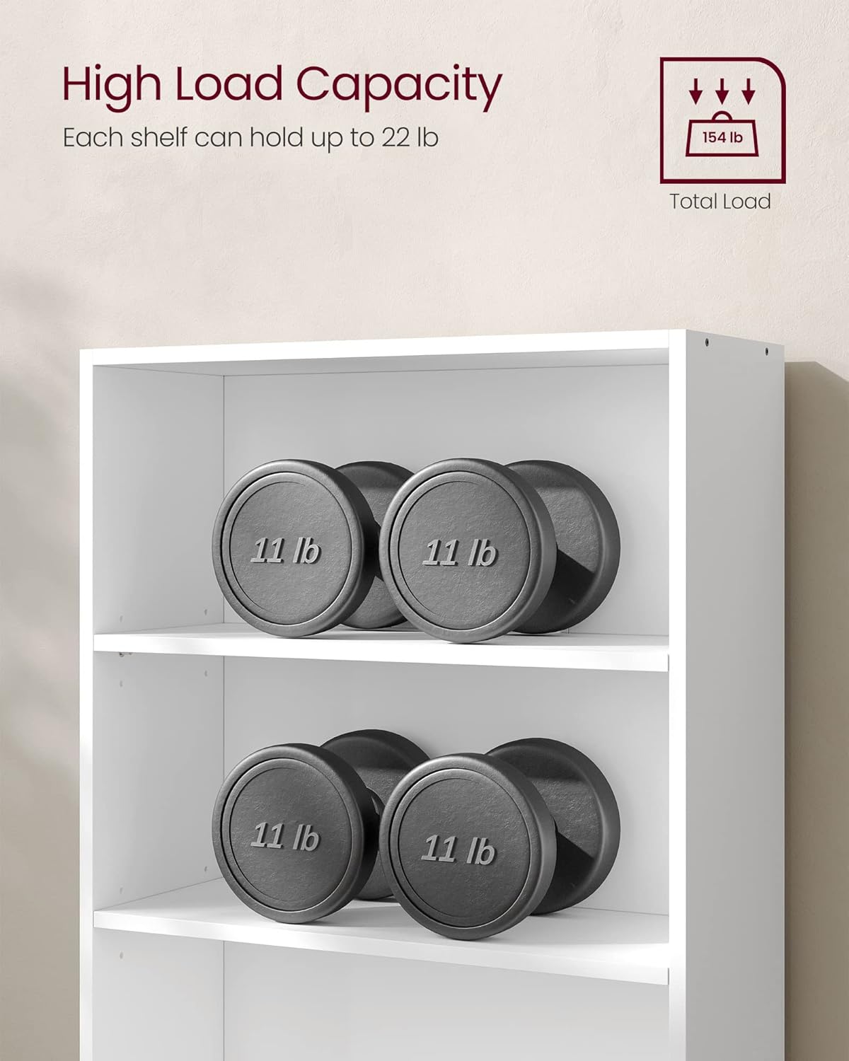 Adjustable Shelves: The first, second, fourth, and fifth shelves can be adjusted to three height positions (up or down 3 cm), making the shelf spacing adjustable between 22-28 cm, allowing tall books, artwork, or storage boxes to easily fit on this bookshelf.