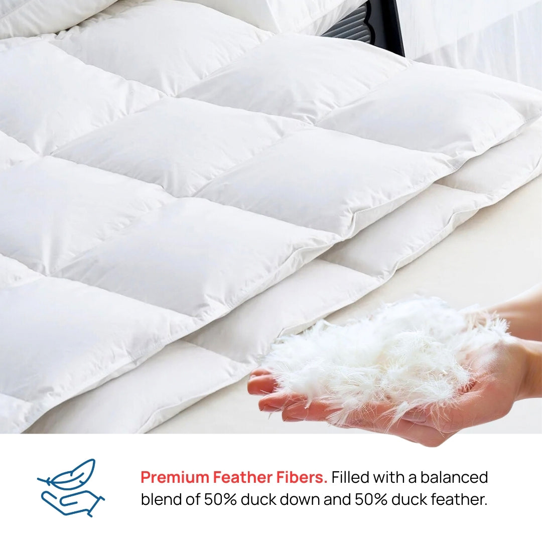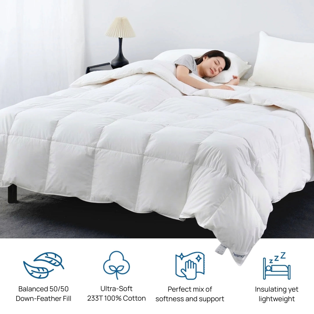 Filled with a balanced blend of 50% duck down and 50% duck feather, it delivers the perfect mix of softness and support. Wrapped in a breathable 100% cotton down-proof cover, it offers a crisp, clean sleep experience night after night.