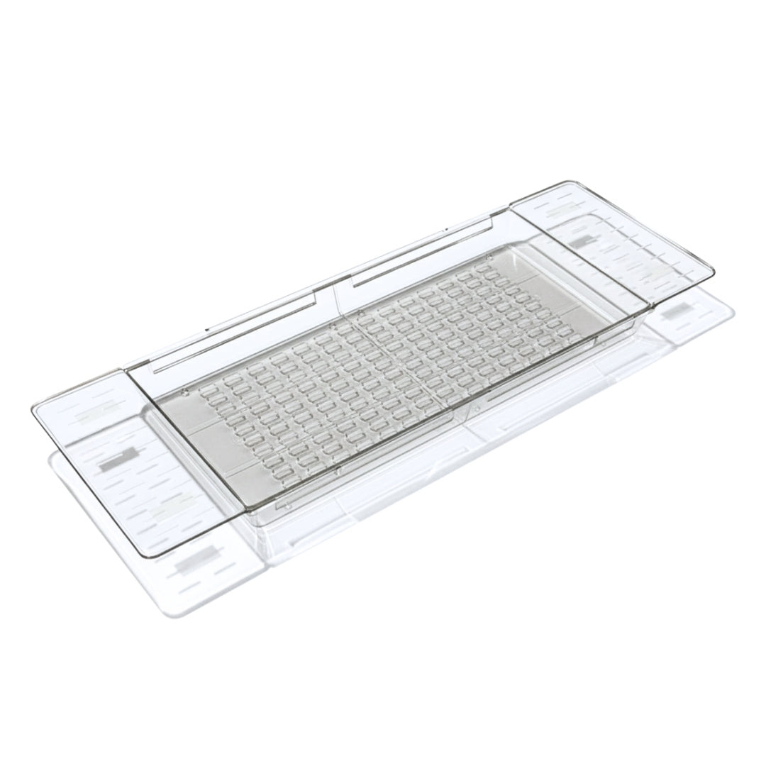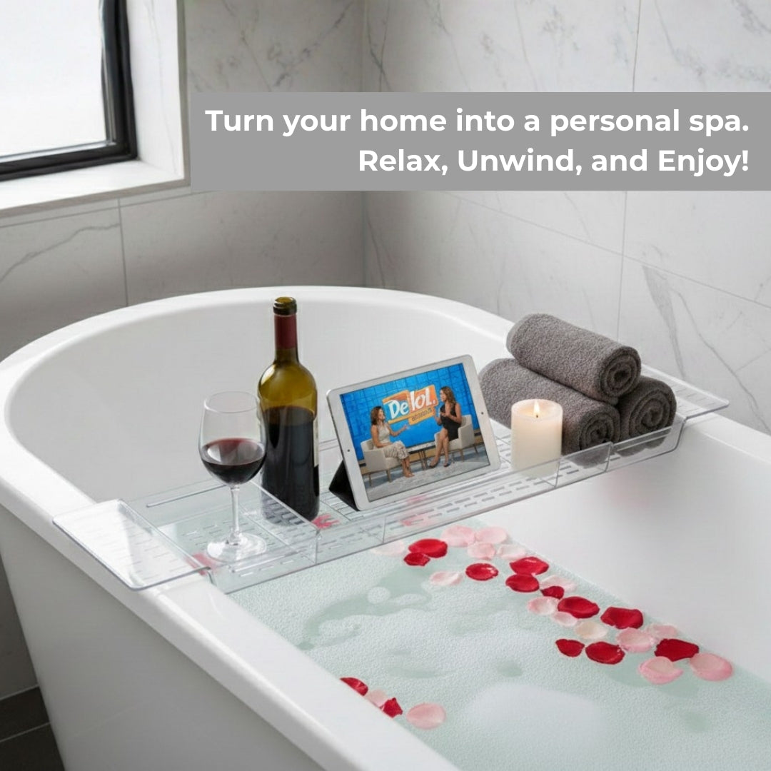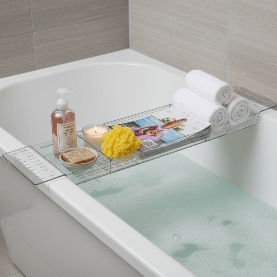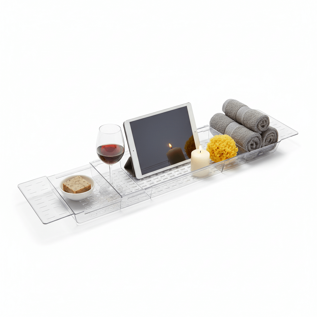 Unwind in style with a sleek, crystal-clear bath tray that transforms any soak into a soothing, spa-like escape. Designed to fit most tubs, this adjustable acrylic bath caddy adds instant luxury and practicality to your bathing ritual – without taking up unnecessary space when not in use. Whether you're sipping wine, watching a show, or indulging in candles and bubbles, this tray puts everything you need right at your fingertips.