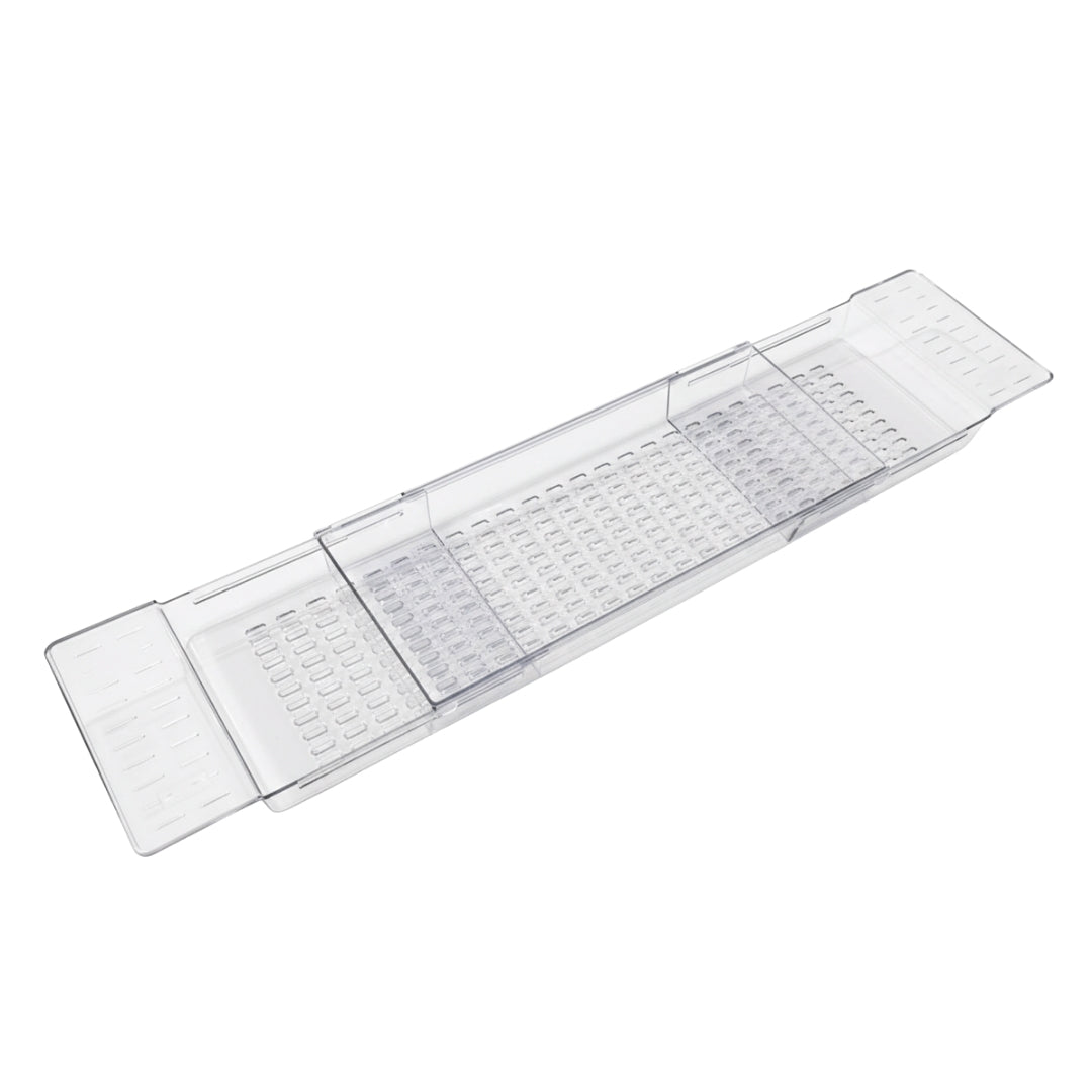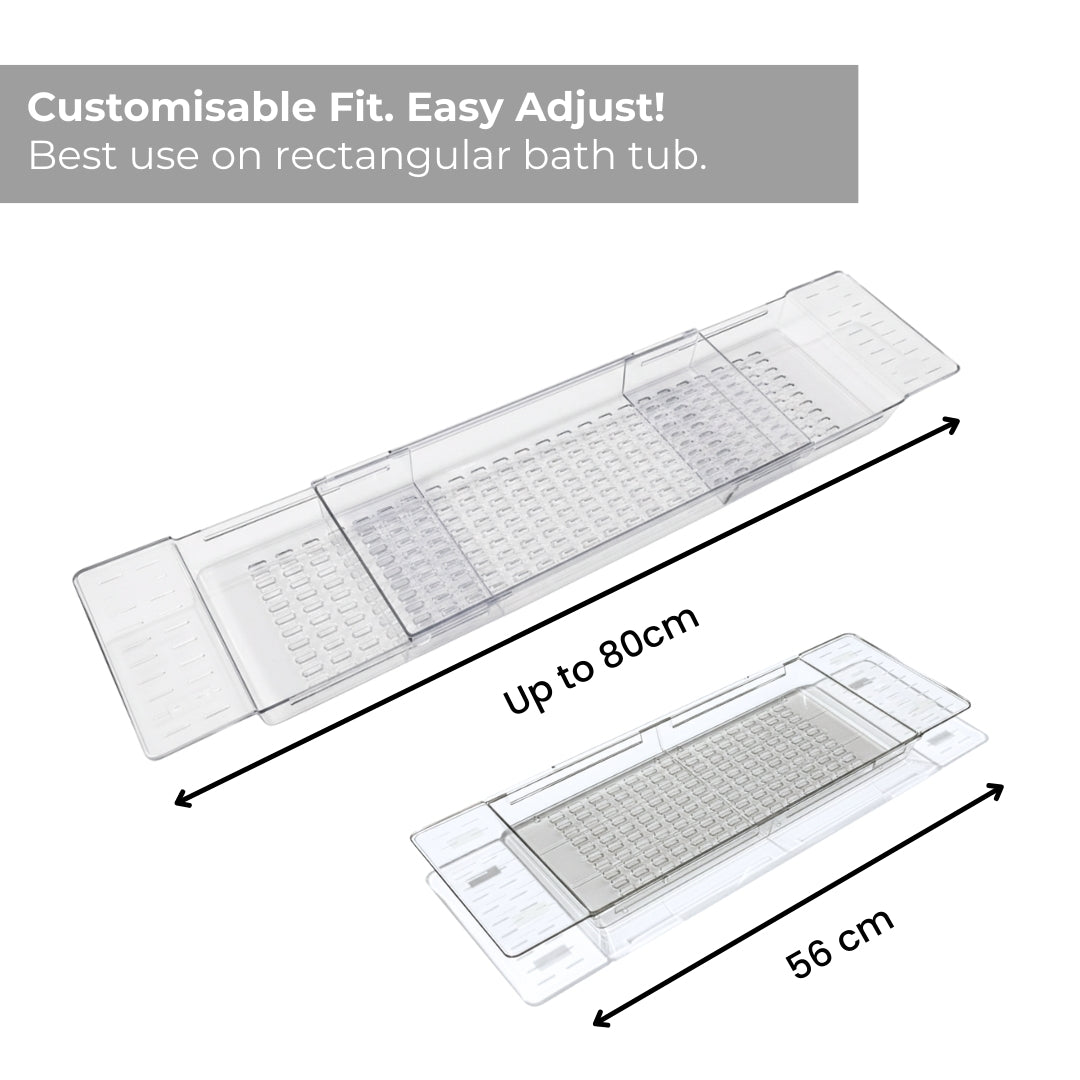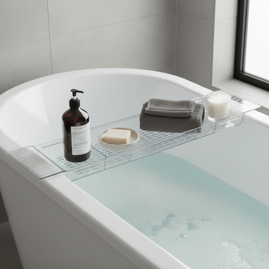 Unwind in style with a sleek, crystal-clear bath tray that transforms any soak into a soothing, spa-like escape. Designed to fit most tubs, this adjustable acrylic bath caddy adds instant luxury and practicality to your bathing ritual – without taking up unnecessary space when not in use. Whether you're sipping wine, watching a show, or indulging in candles and bubbles, this tray puts everything you need right at your fingertips.