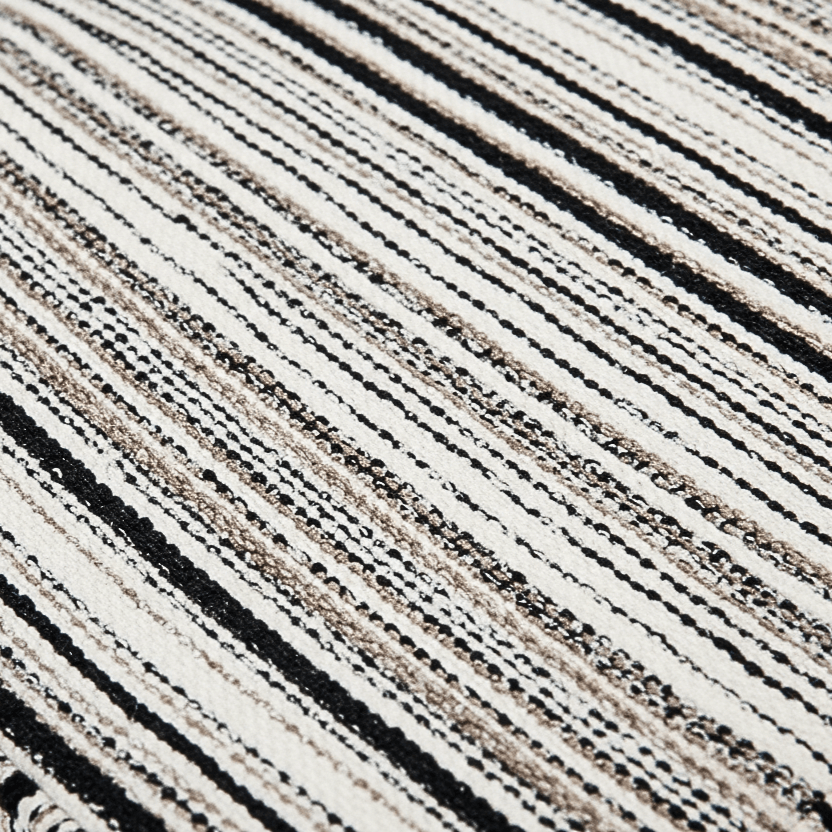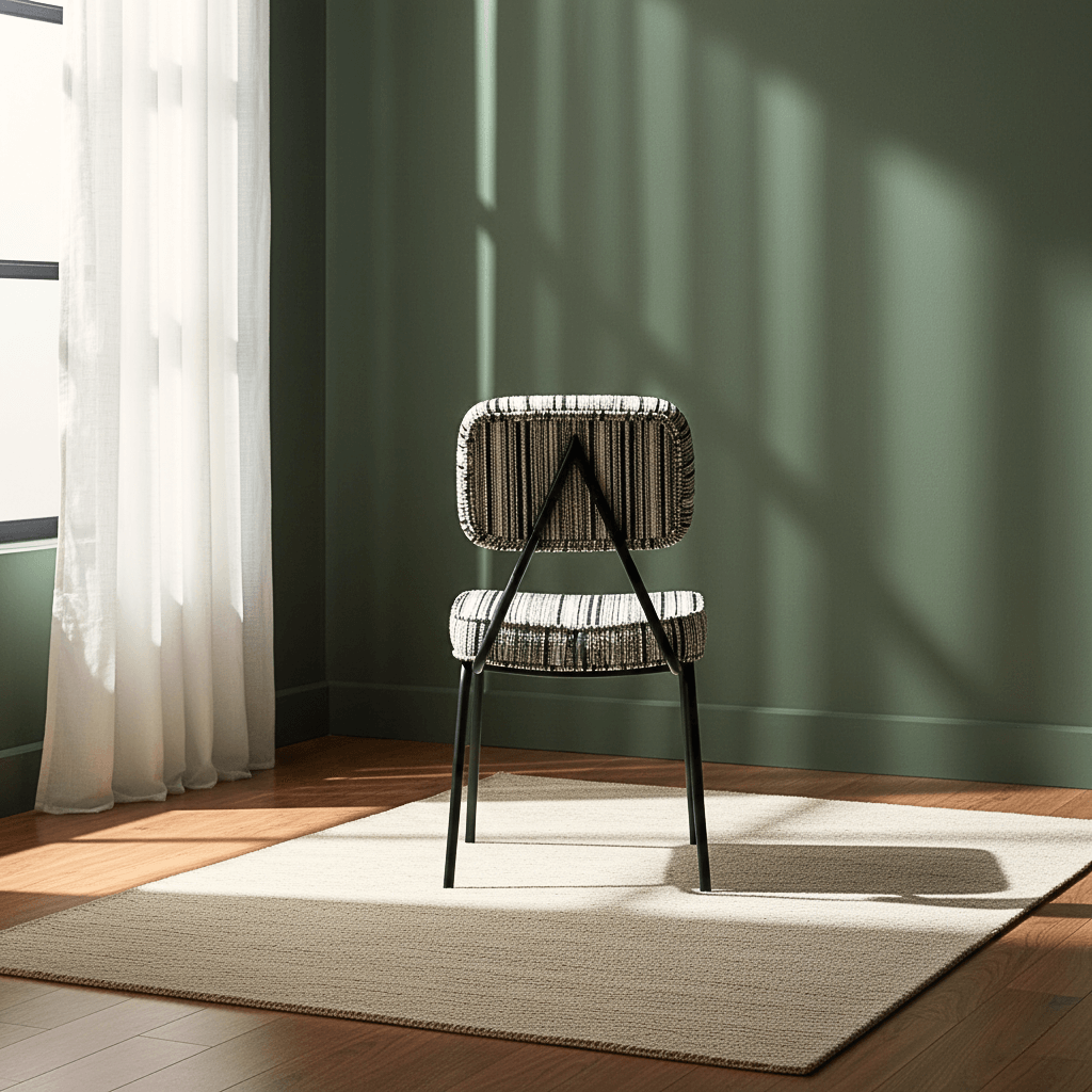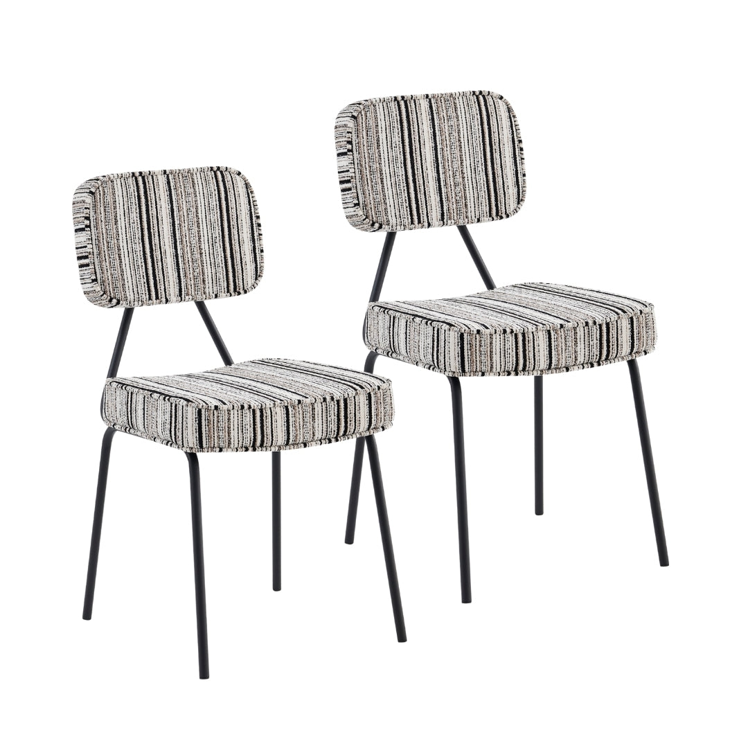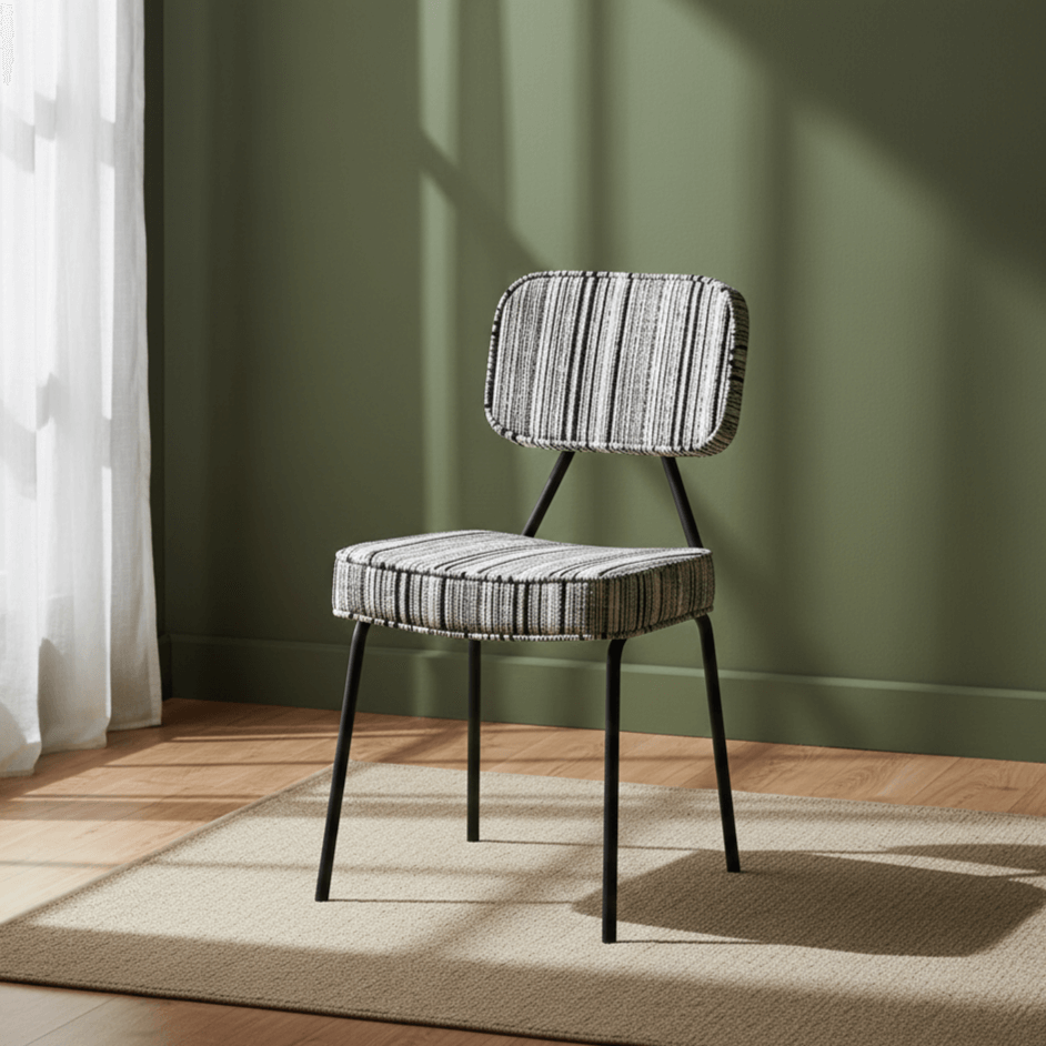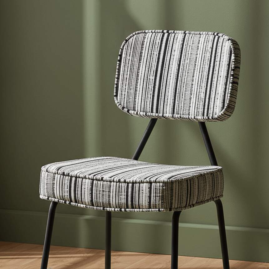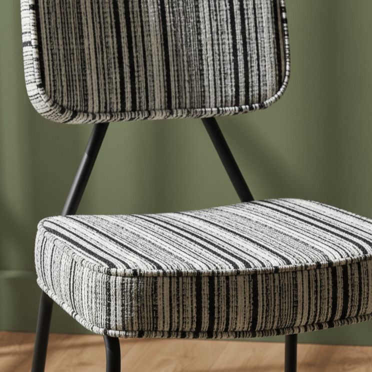 - Materials: Iron frame & legs, plywood seat, Polyester striped fabric, polypropylene foot pads, high-density foam padding, powder-coated finish