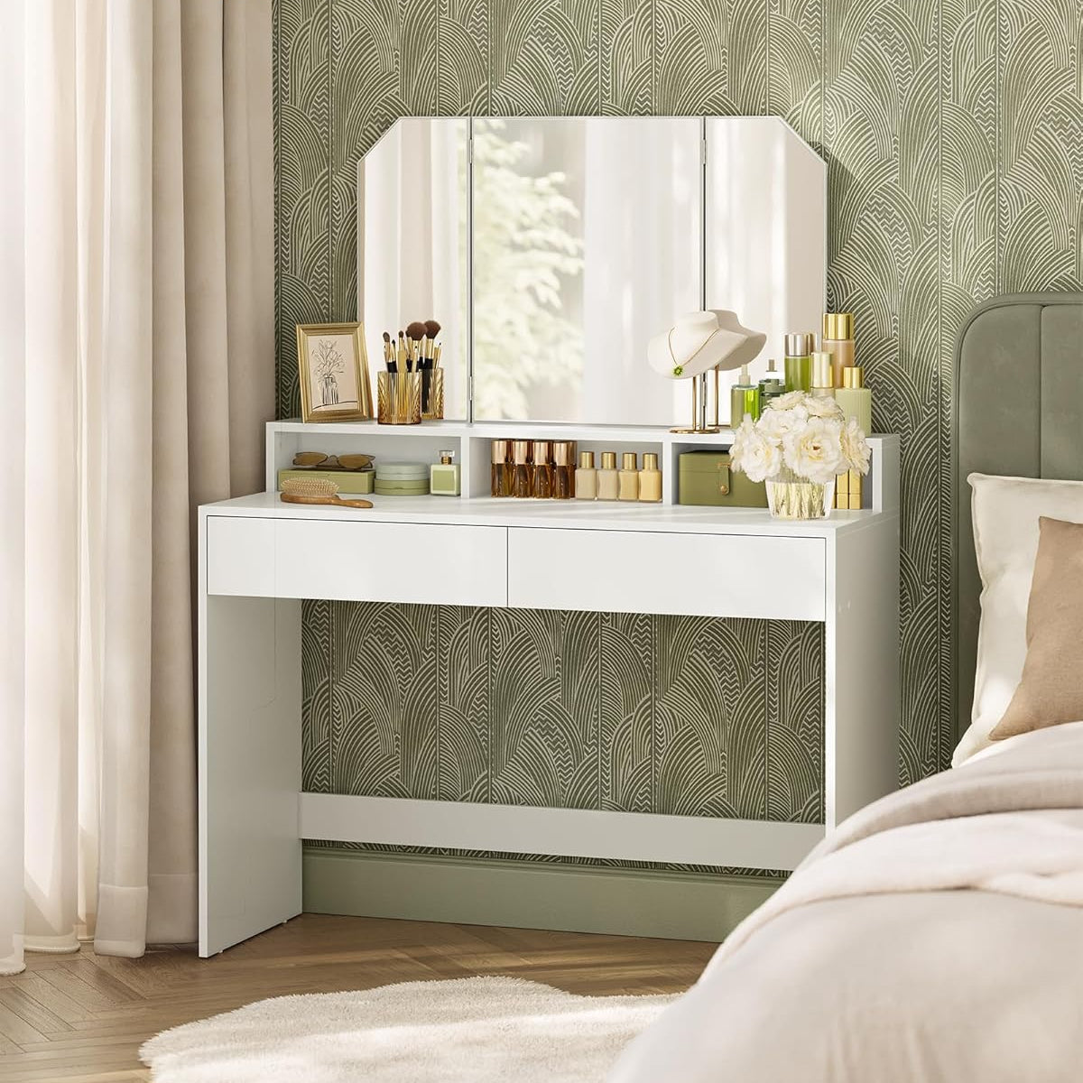 Dressing Table with Tri-Fold Mirror And Drawers