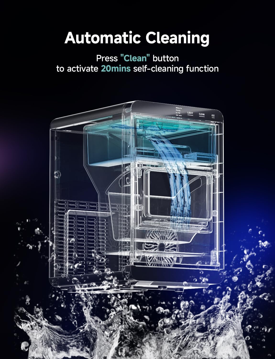 Fill the 1.8L water tank, press the “ICE” button, and you’re ready to go. The LED-lit chamber lets you monitor progress, and the machine will pause automatically when the basket is full or water runs low.