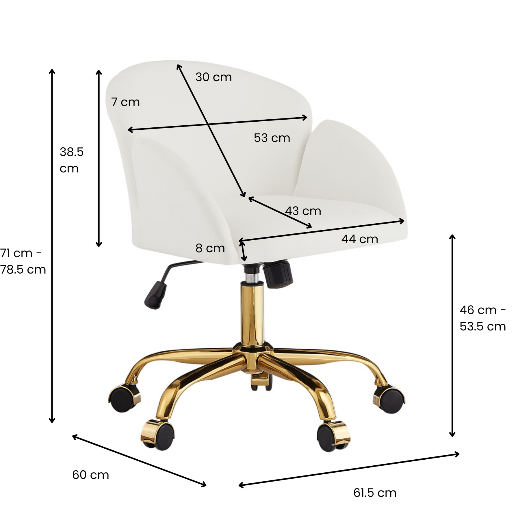 Transform your home or office with this stylish white velvet office chair, featuring a luxurious gold chrome base. Combining a cocoon-like design for superior support and all-day comfort, this mid-height chair combines elegance with functionality, making it a perfect addition to any workspace.