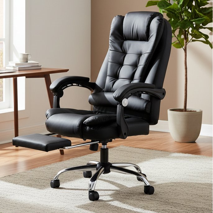 Give your home office a stylish upgrade with this Leather Executive Chair. Enjoy long hours of comfort with its ergonomic design, reclining back, and plush high cushion that let you sit with ease. Take a breather with the built-in footrest, and adjust the seat height and armrests to create a personalised setup. Glide smoothly around your workspace thanks to the 360-degree swivel and rolling wheels. This chair offers the perfect mix of style and function, keeping you productive and relaxed all day long.
