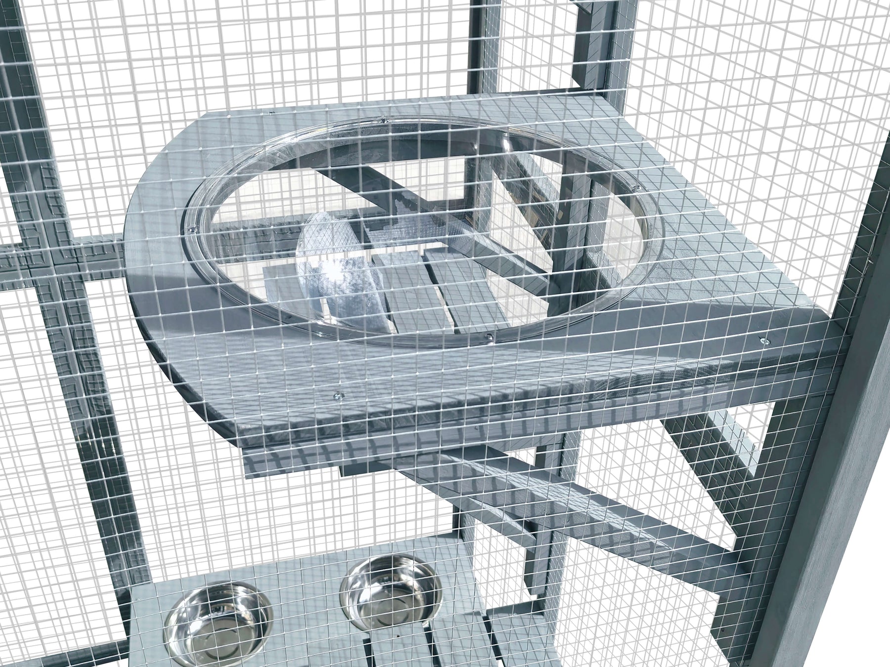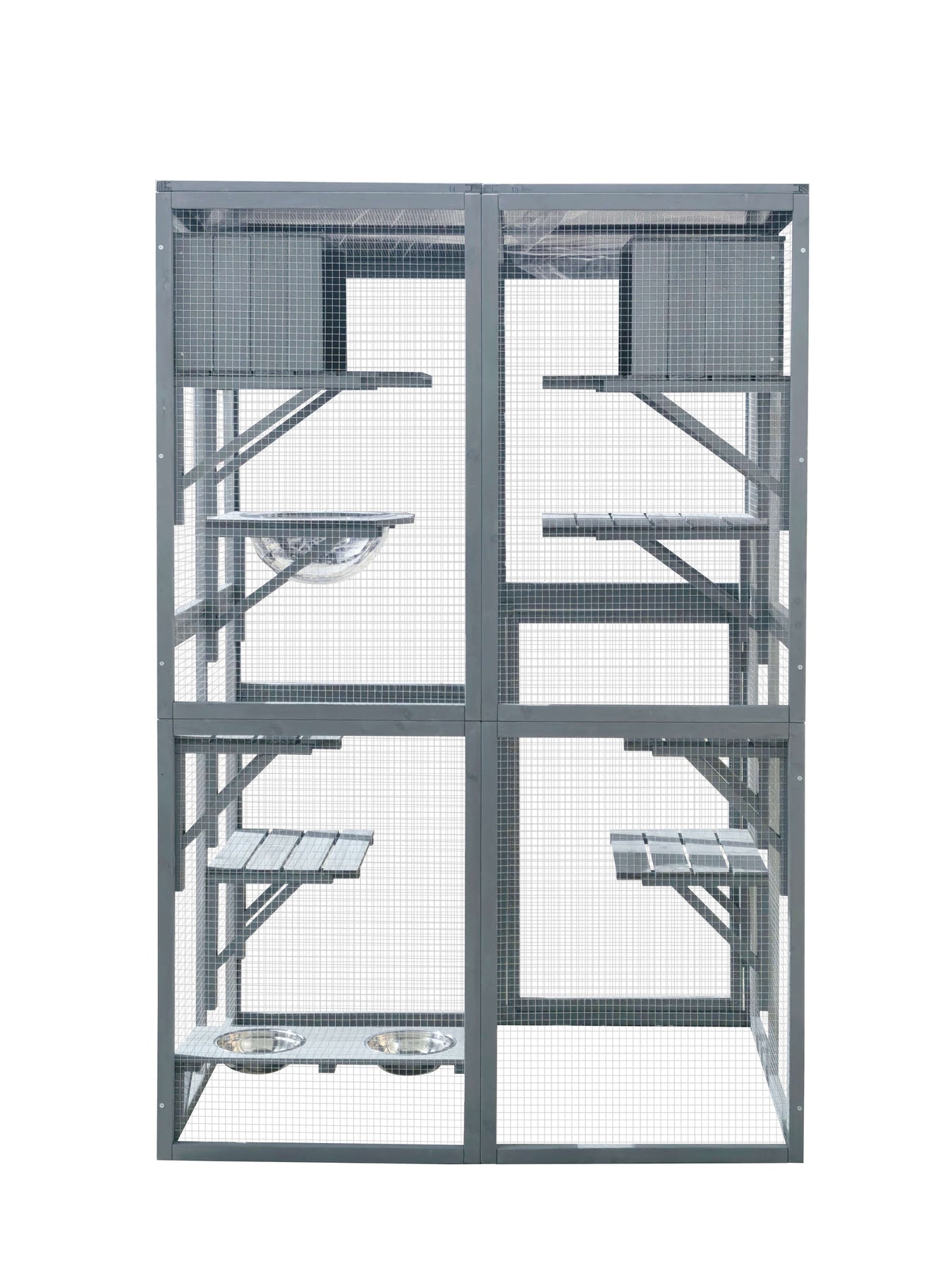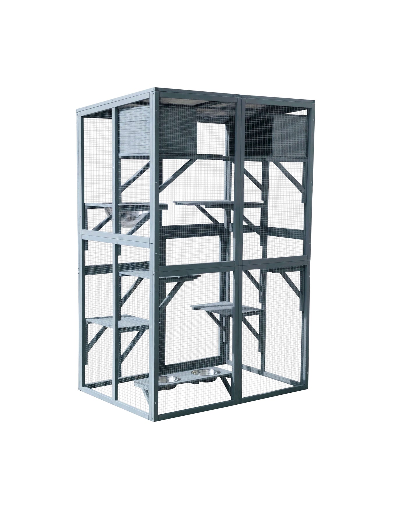 Built-in feeding station: Features an elevated shelf with two stainless-steel bowls for easy access to food and water.