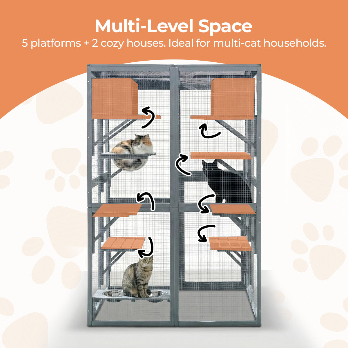Compact multi-level play area: Includes 5 platforms, 2 sleeping houses, 2 feeding basins, and a space capsule-style transparent cat bed, letting your cats climb, rest, and explore comfortably in a compact footprint.