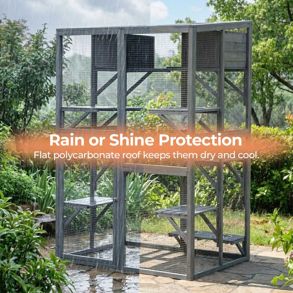 Weather-protected roof: The flat roof is covered with polycarbonate hollow sheet to keep your pets shaded from the sun and protected from rain.