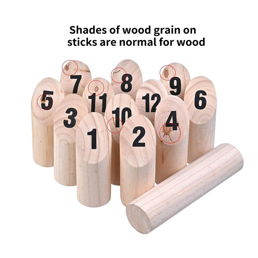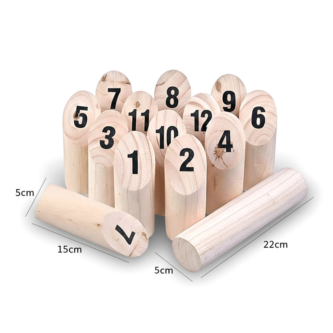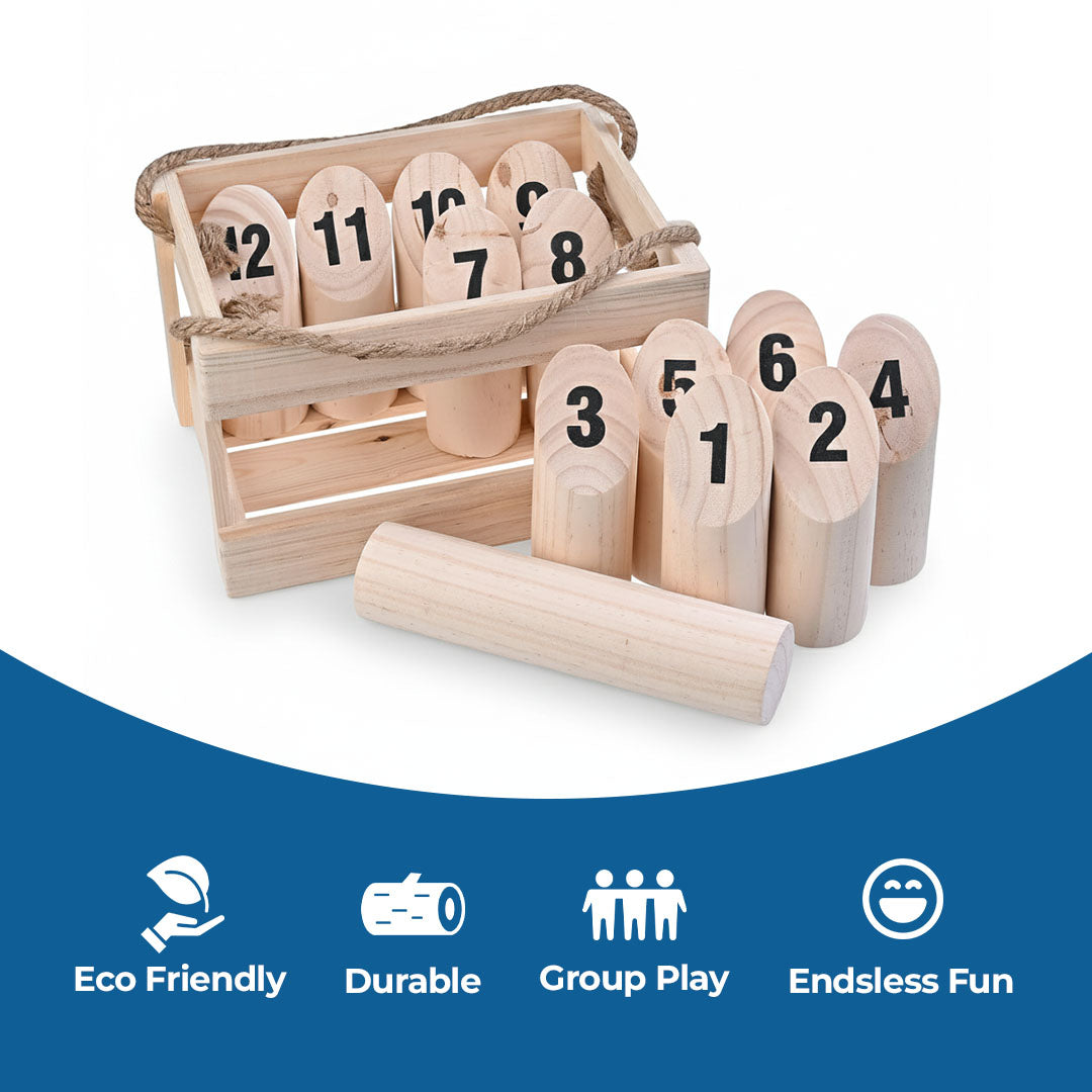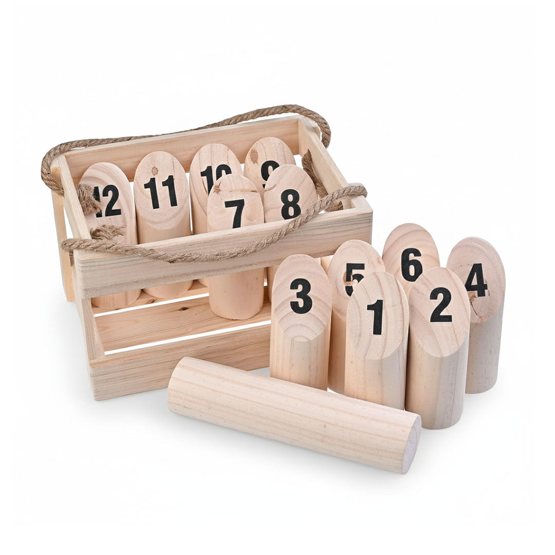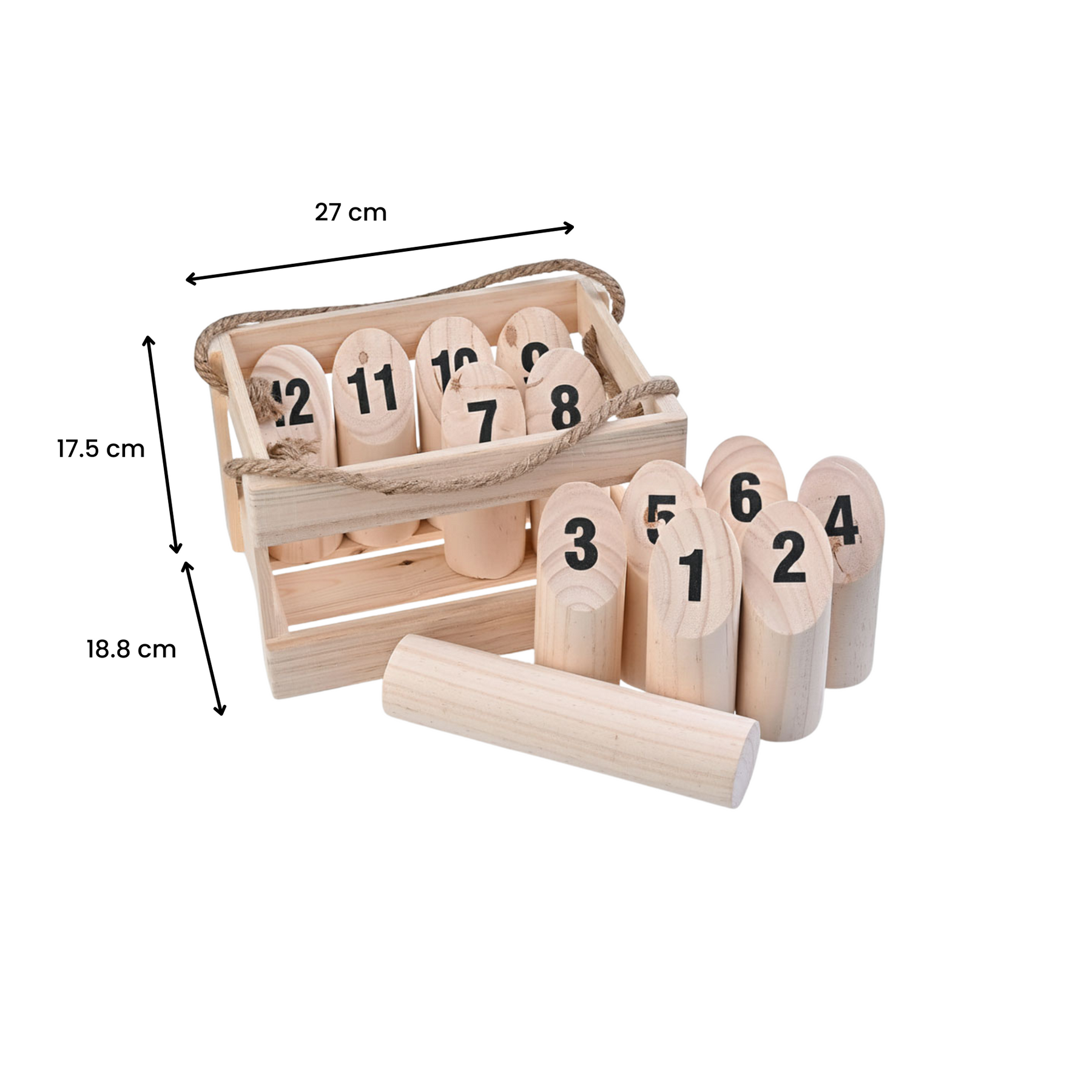• Complete wooden set: Includes 12 numbered skittles, 1 throwing pin, and a durable wooden storage crate – everything you need to start playing right away.