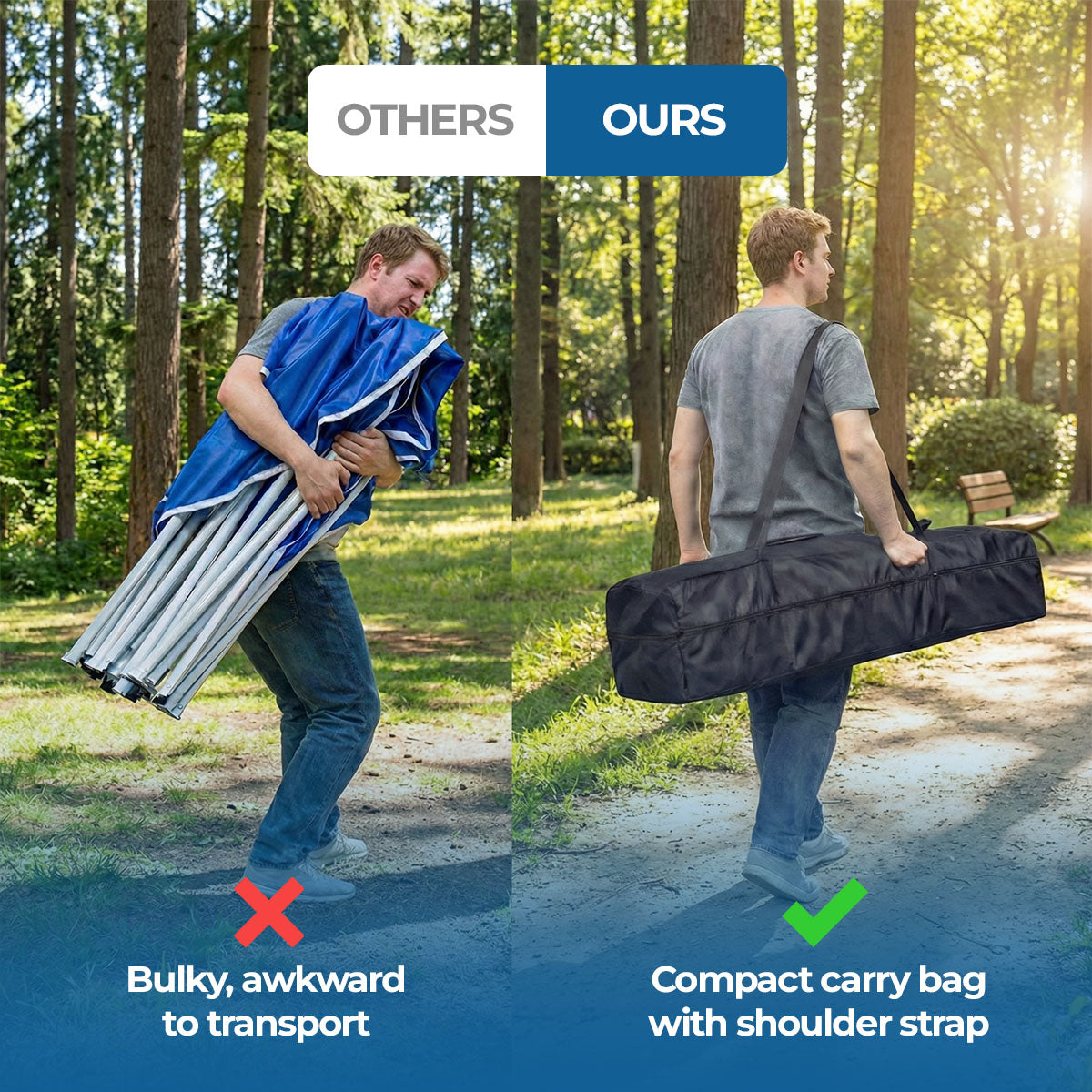 - Quick pop-up frame: Lightweight steel frame with a foldable design and no tools required. Set up or take down in just minutes.