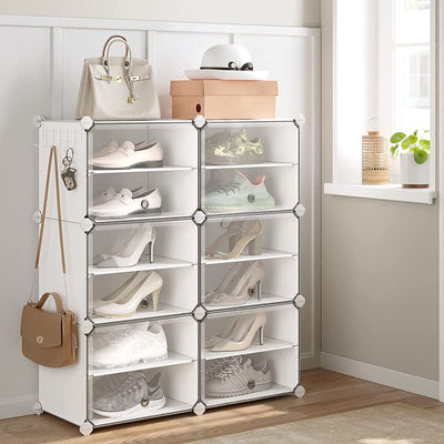 This multifunctional plastic shoe storage organiser, capable of housing up to 24 pairs of shoes, also functions as storage for bags and clothing. Its space-saving side hooks provide a convenient place to hang hats or dog leads.