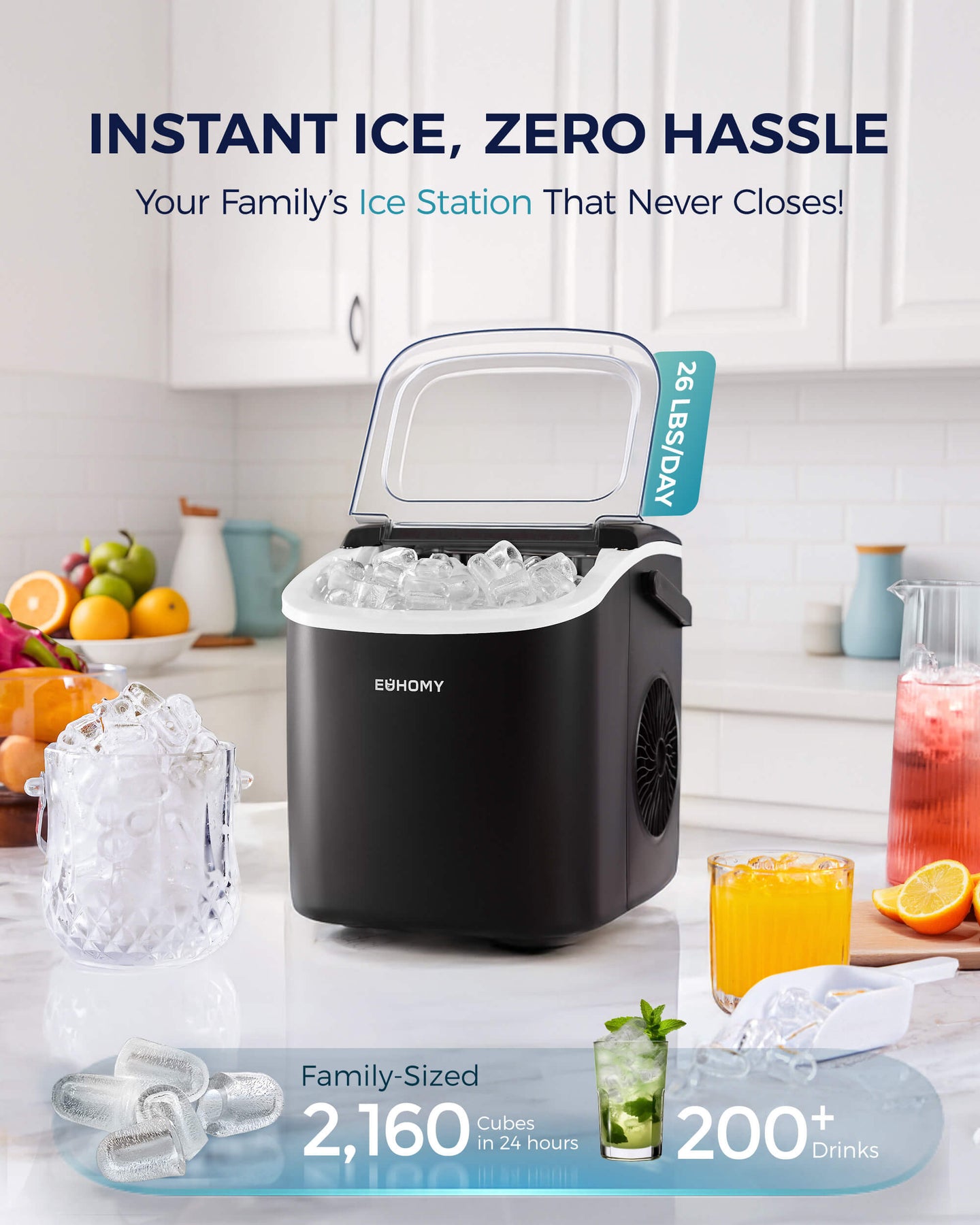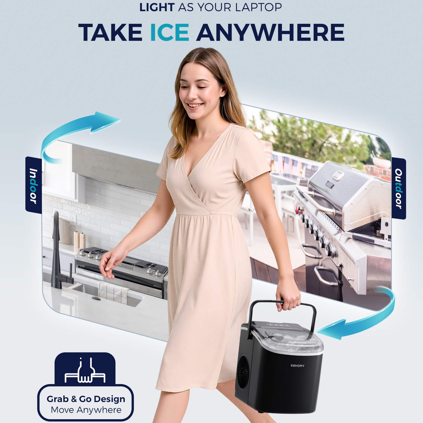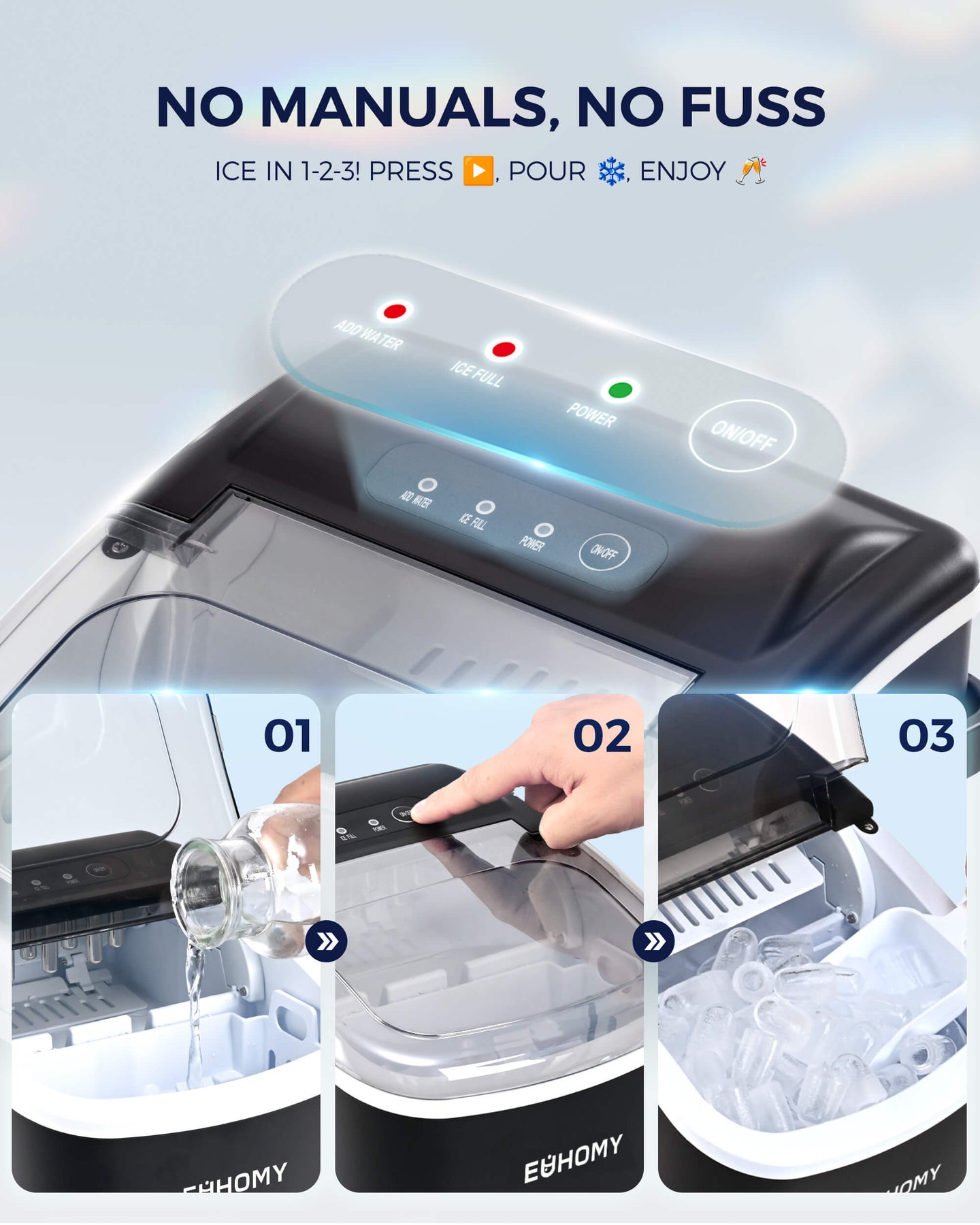Just fill the water tank, press “ON”, and enjoy fresh ice in minutes. Its user-friendly control panel keeps things simple, while the automatic shut-off prevents overflow. It stores up to 0.6kg of ice at a time — ideal for gatherings, daily use, or outdoor fun.
