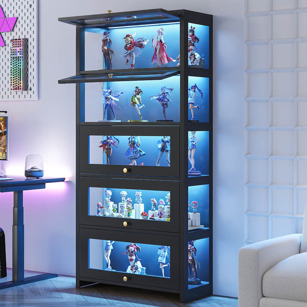 Showcase your décor, collectibles, or glassware in this bold and modern Display Cabinet with Flip-Up Glass Door – Black. Combining a clean industrial aesthetic with practical lighting and lift-up access, this cabinet is ideal for living rooms, studios, and display areas. With its five-tier design, 7-colour LED lighting, and durable tempered glass, it’s a standout piece that delivers both function and flair.