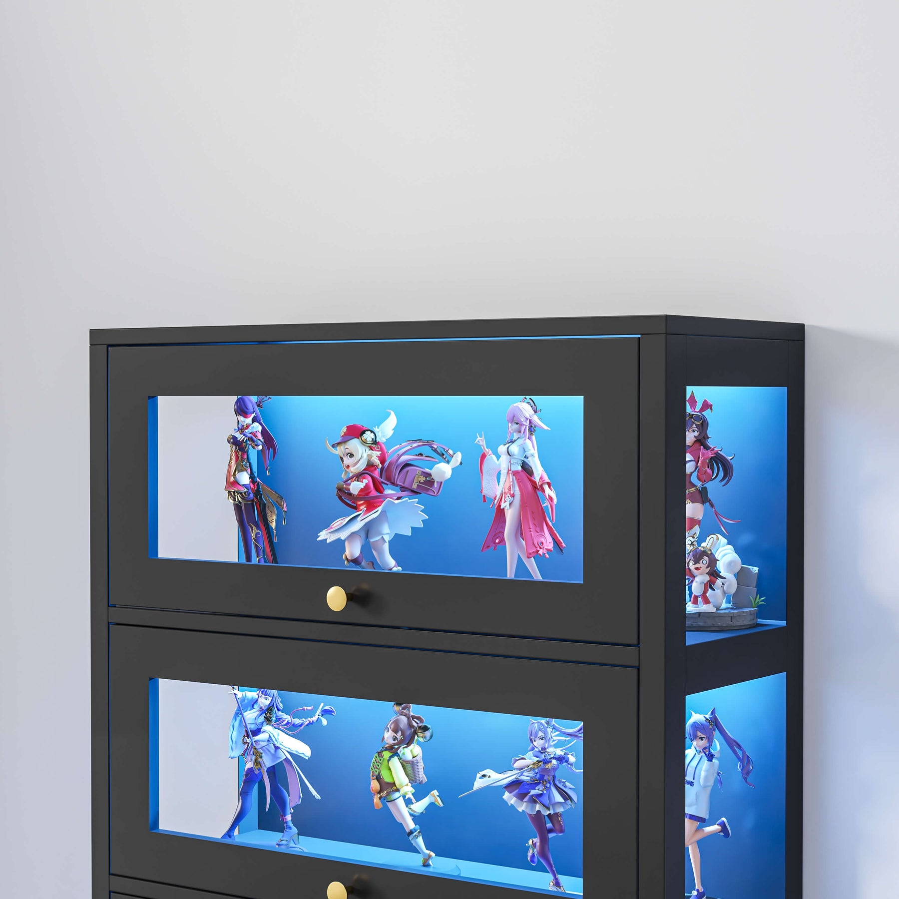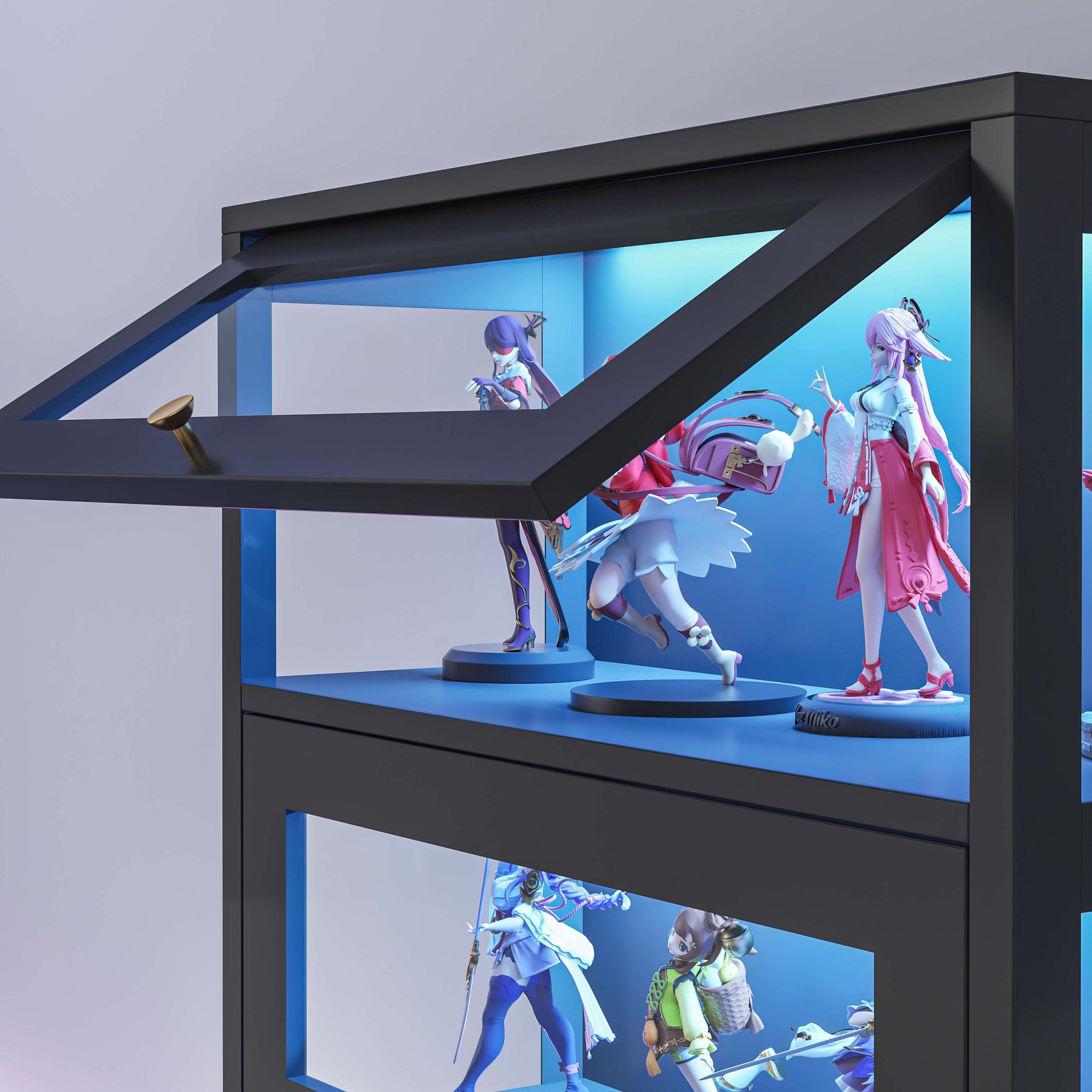 Flip-Up Glass Doors: Top-hinged doors on each tier open upwards for smooth, accessible display without obstructing the view.